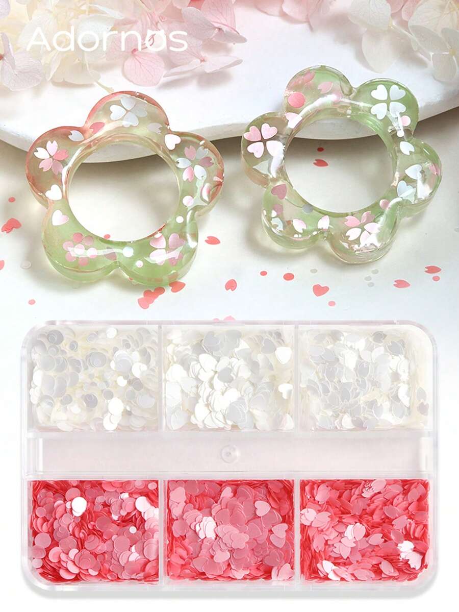 6格粉色春日亮片环氧树脂流沙填充粉白圆形心形樱花花瓣形状亮片树脂模具填充春夏工艺品DIY制作