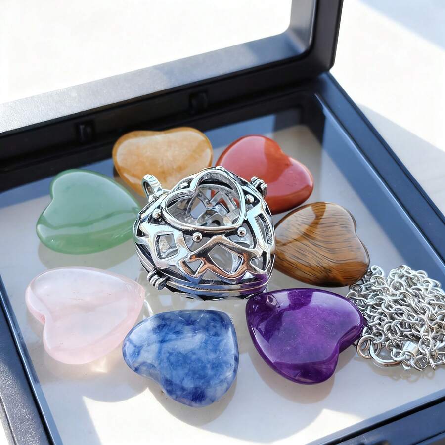 7件套水晶吊坠套装,心形宝石,笼锁吊坠,水晶石,情人节、万圣节、圣诞节、新年礼物,送给爱人