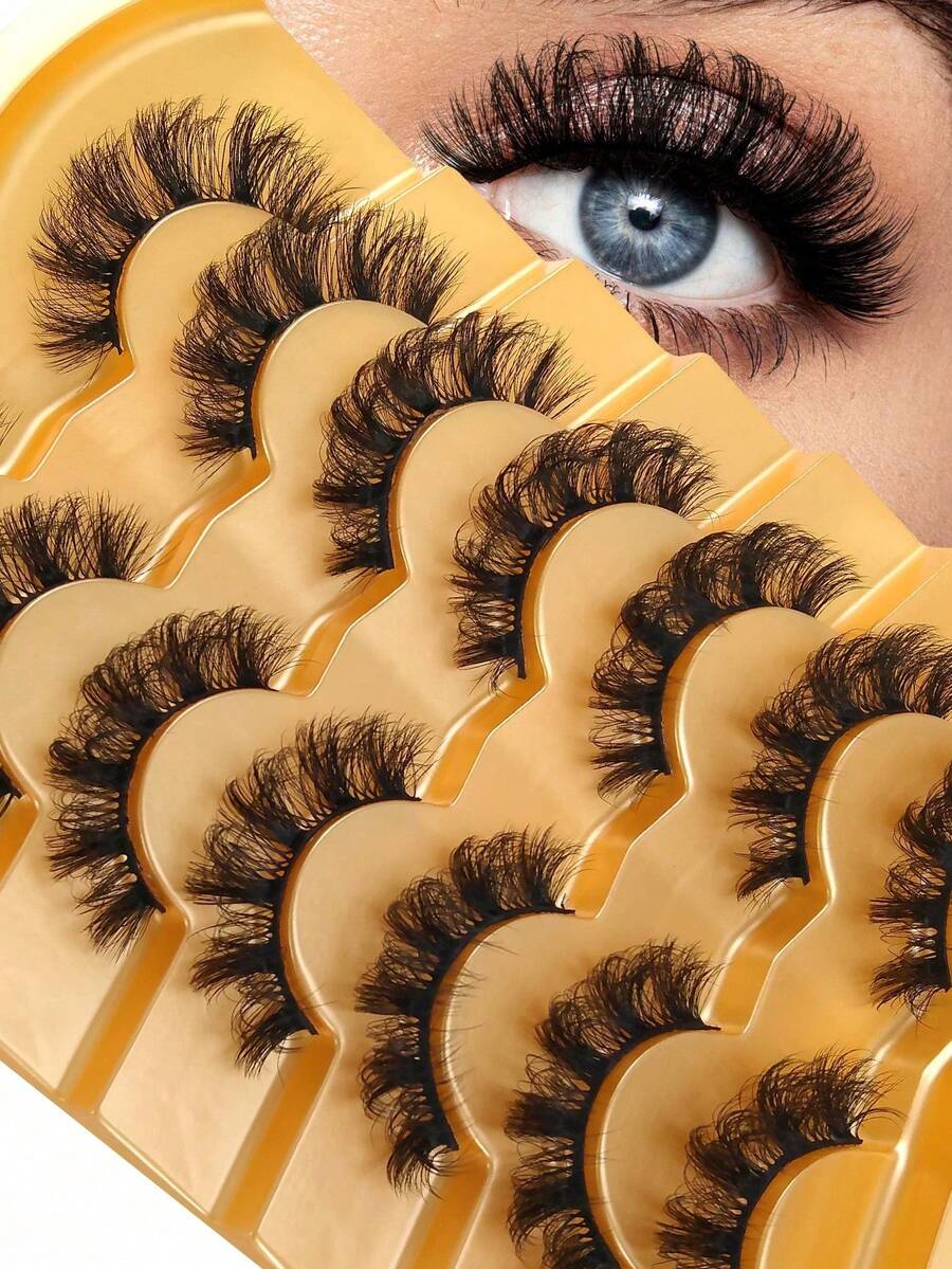 7片D型卷翘蓬松假睫毛,5D猫眼睫毛,自然柔软,逼真俄式风格,可重复使用仿貂毛睫毛,适合日常妆容和派对妆容,单片睫毛簇