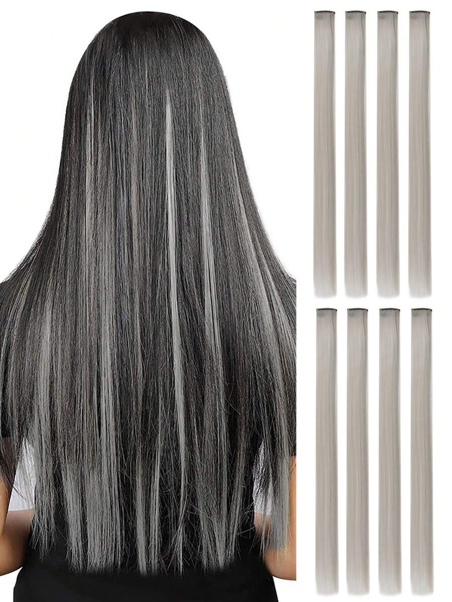 8 片彩色夹式接发,20 英寸长直发,夹式合成假发,万圣节角色扮演装扮时尚派对圣诞节狂欢节音乐节新年礼物,女士(灰色)