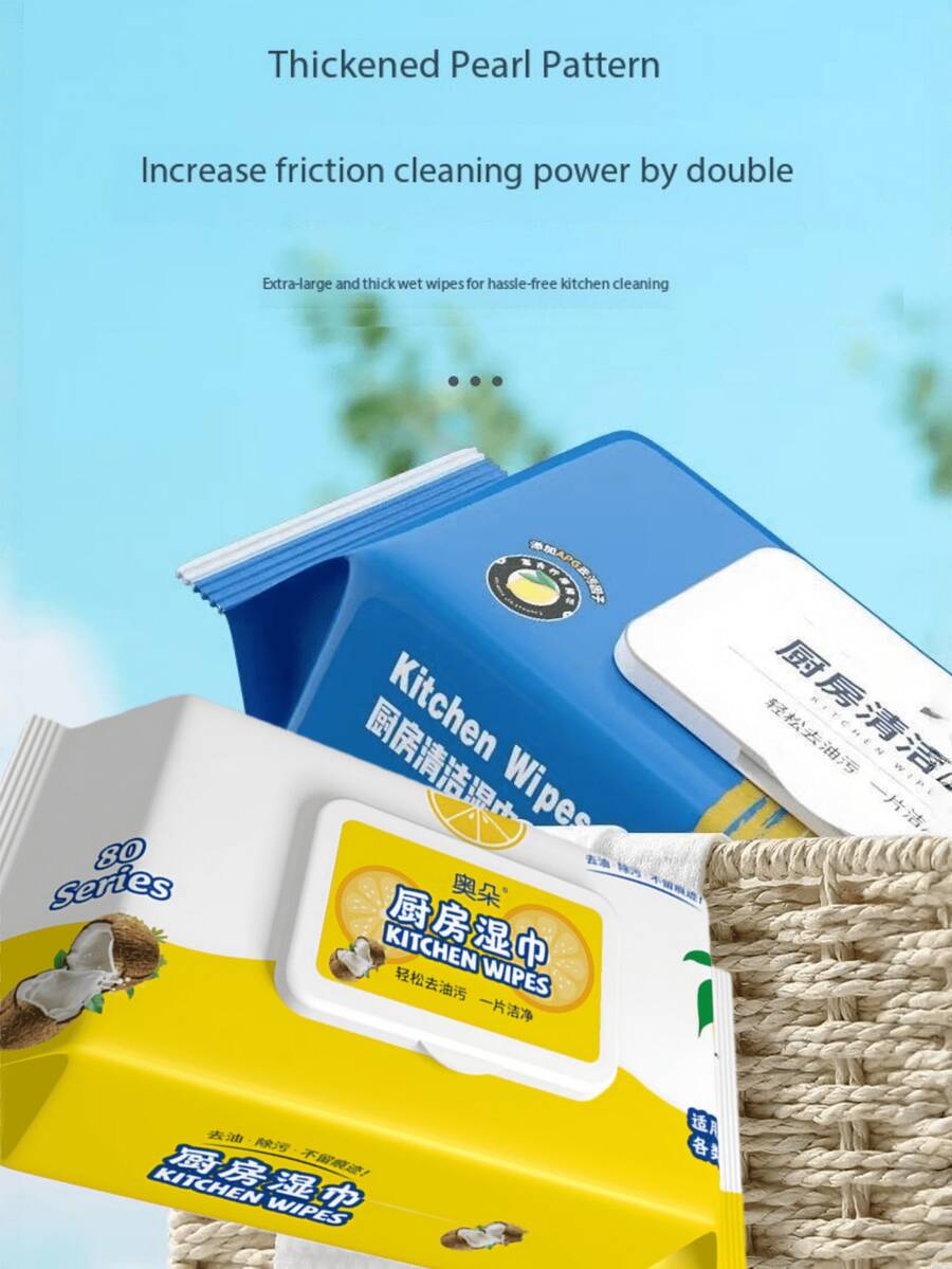 80张加厚厨房湿巾,超大包装,厚实耐用,有效清洁油脂和污垢,适用于炉灶、烤箱、台面,柠檬香味