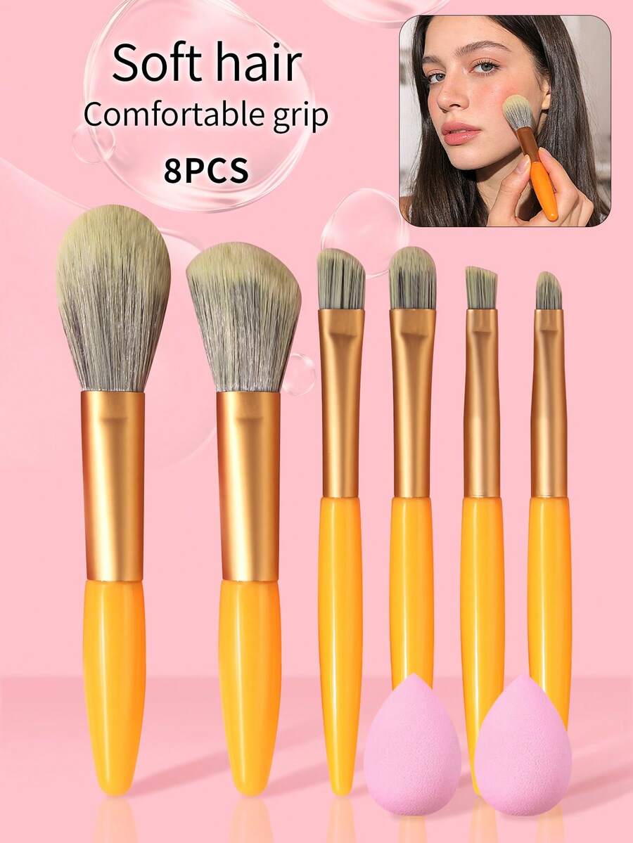 • 8件套化妆刷套装 - 粉底刷、眼影刷、腮红刷、修容刷、眉刷、迷你化妆海绵、新手化妆工具 - 黃色 - 查看 8