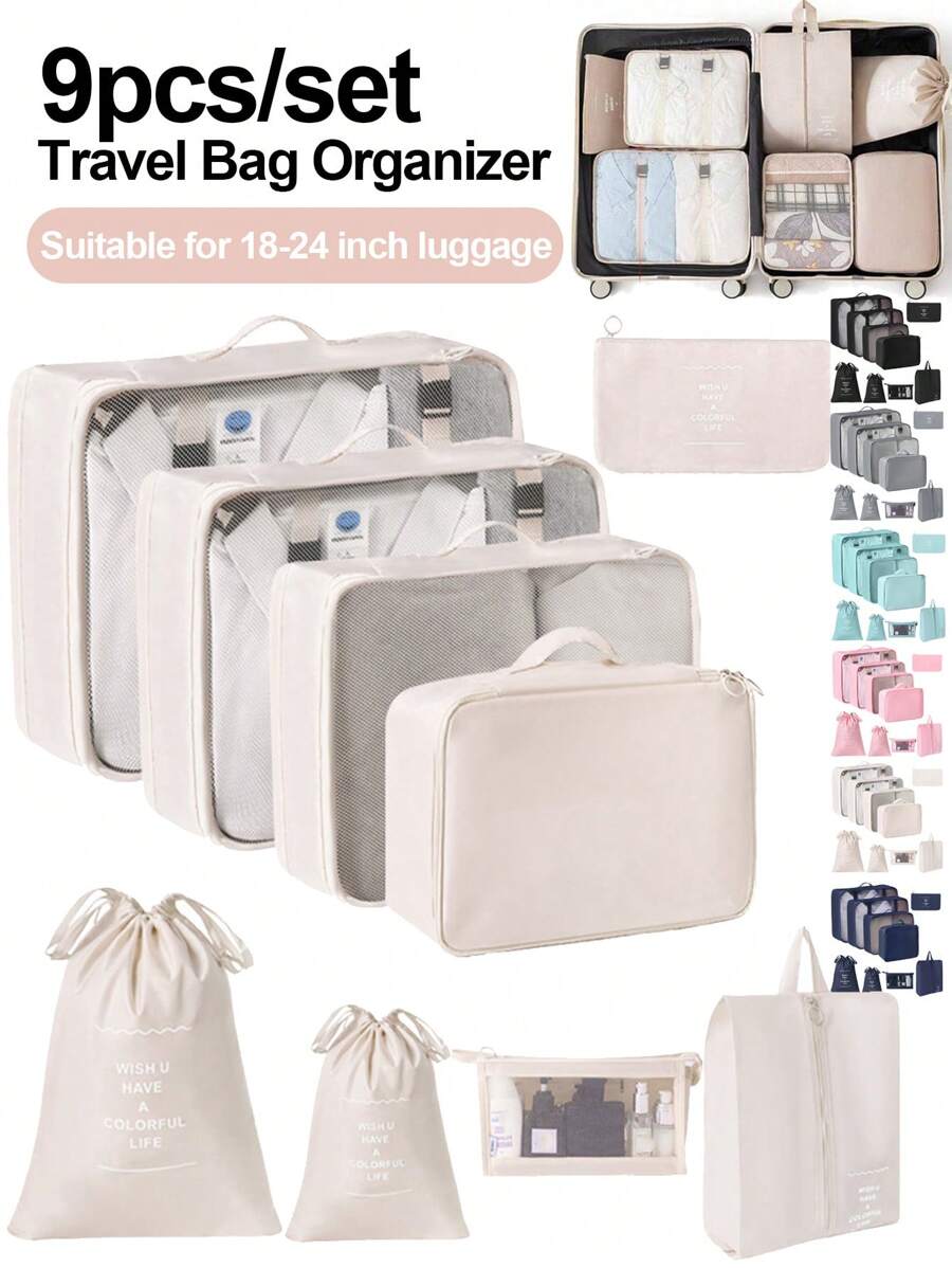 9/1 套旅行收纳袋,包括行李收纳袋、旅行手提包、化妆包、储物袋、洗衣袋、网袋、化妆包、电子产品包、鞋袋、瓶套、束口袋、行李袋