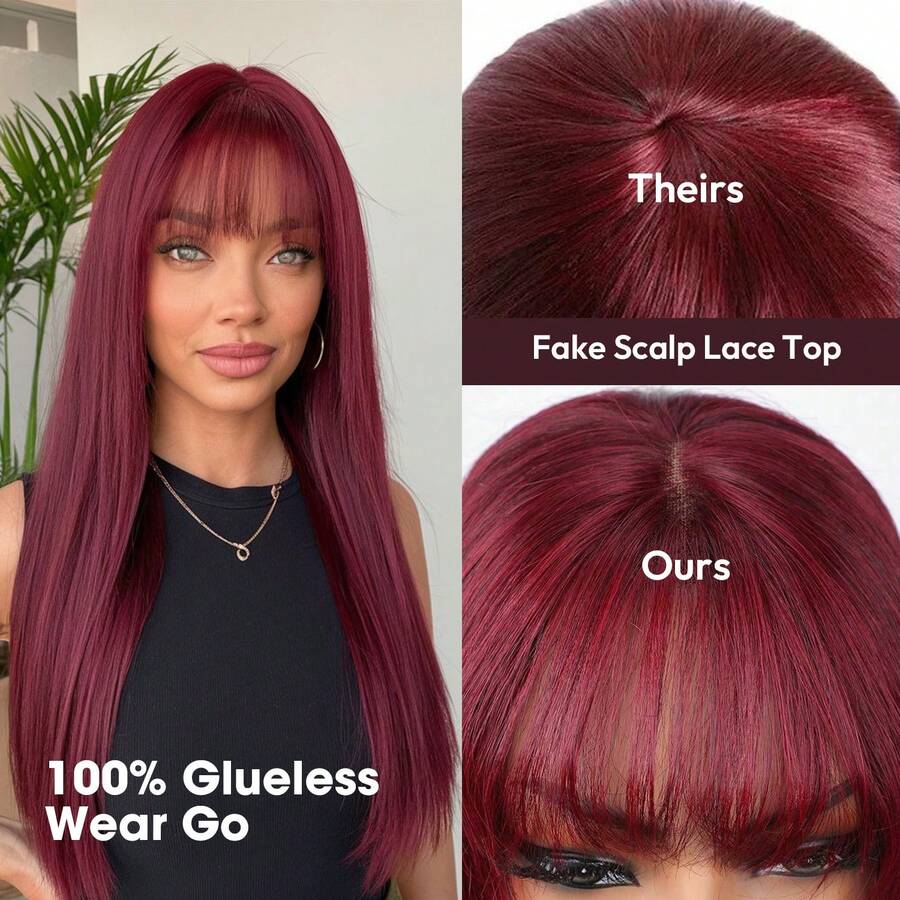 99J 樱桃红直发无缝真人发假发,带柔软刘海,无需胶水,真发品质,无结