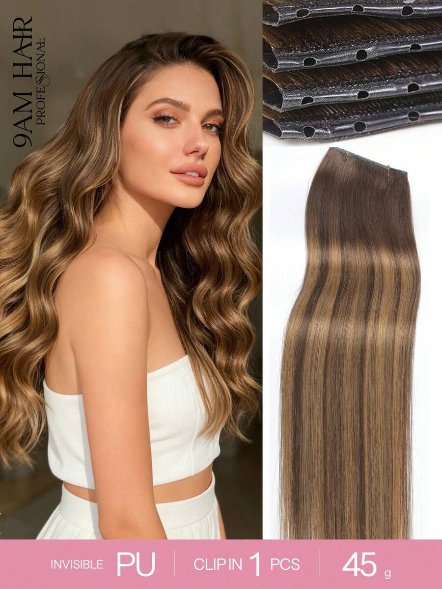 • 9AM HAIR 蝴蝶结发片,真人发,无胶 OVO PU 孔,手工编织,隐形 DIY 双层发片,直发,1 片装,16 英寸 - S4/4/27 - 查看 9