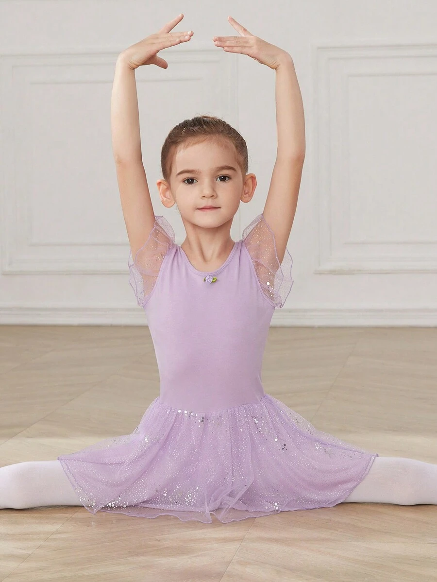 女童芭蕾舞紧身衣 交叉后背 儿童芭蕾舞裙 带亮片网眼荷叶袖 高弹力 适合舞蹈表演和练习服