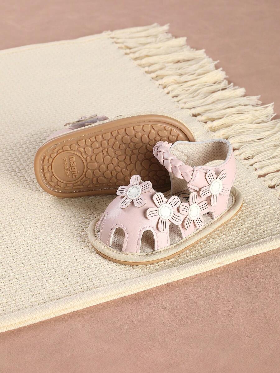 一双女婴鞋,采用魔术贴搭扣设计,可爱的碎花平底凉鞋,适合夏季穿着。