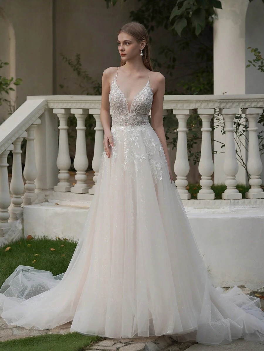 ANGELAG 女士花卉刺绣薄纱设计优雅吊带婚纱