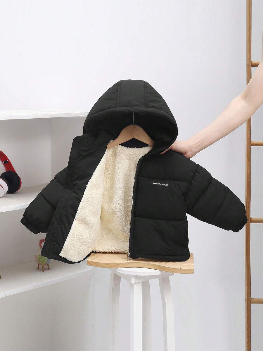 秋冬新款黑色男婴保暖连帽夹克,保暖衬里加厚派克大衣,卡通印花风衣外套