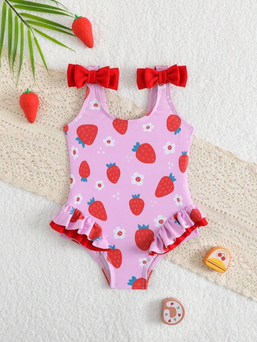 女婴沙滩装樱桃印花针织面料肩部蝴蝶结荷叶边连体泳衣,时尚休闲优雅,适合游泳、度假、夏季穿着