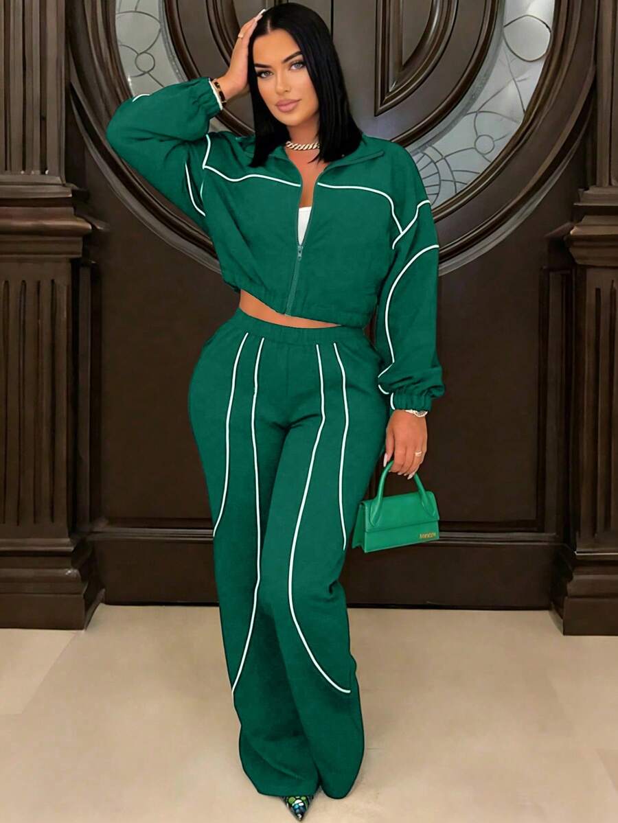 黑白撞色条纹两件套运动服,包括一件短款拉链外套和一条阔腿裤,休闲时尚,弹性腰带,适合日常外出和街头潮流,四季皆宜。