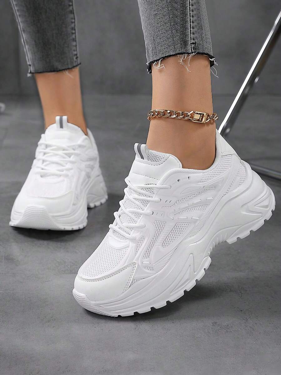 1双青少年休闲运动鞋,透气网面鞋面,厚底,坡跟设计,时尚百搭的白色鞋款,舒适防滑,适合女孩、学生、校园穿着,四季皆宜。