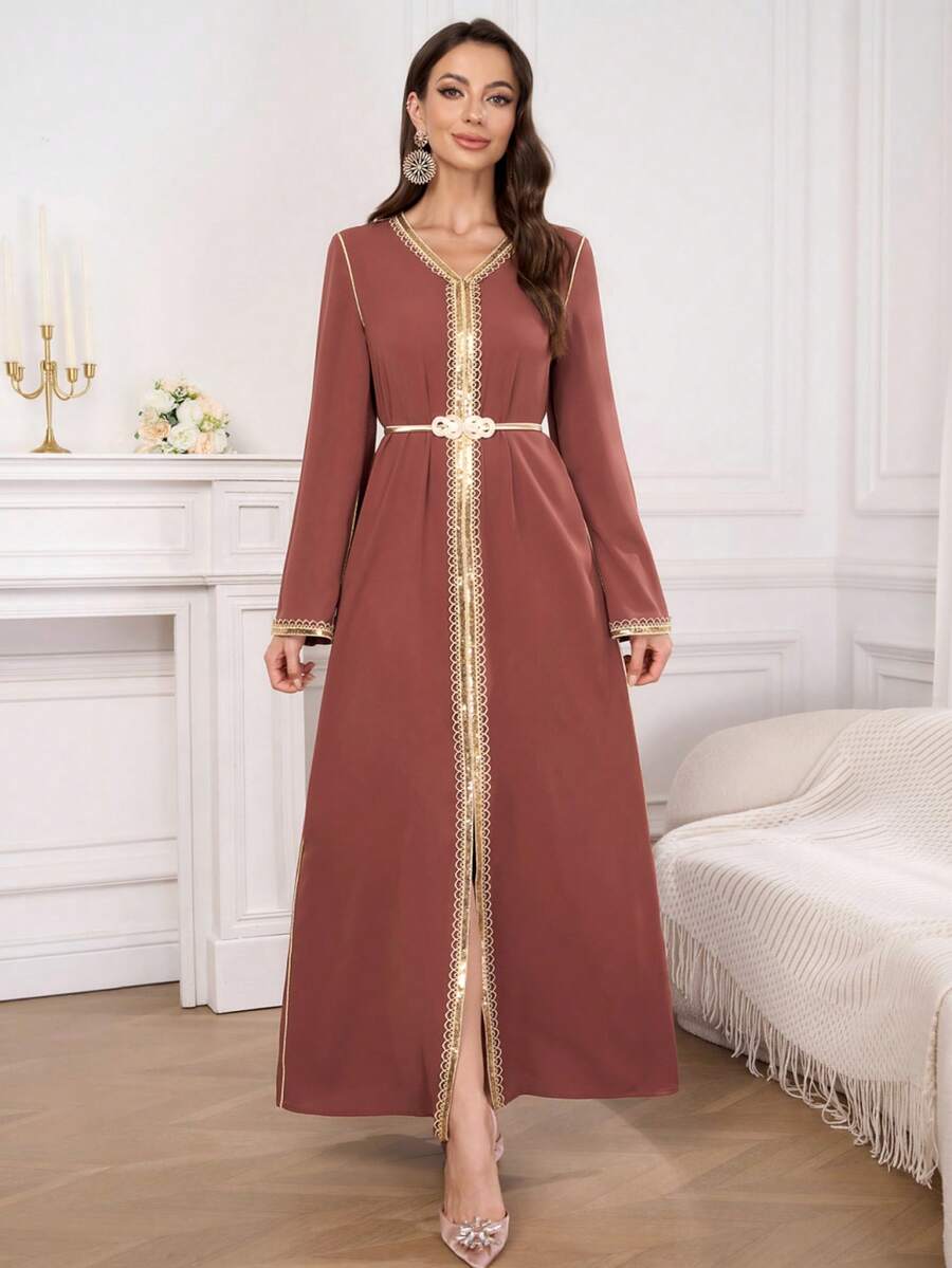 • 雪纺V领金色蕾丝超长阿拉伯风格女士长裙 - 棕色 - 查看 2
