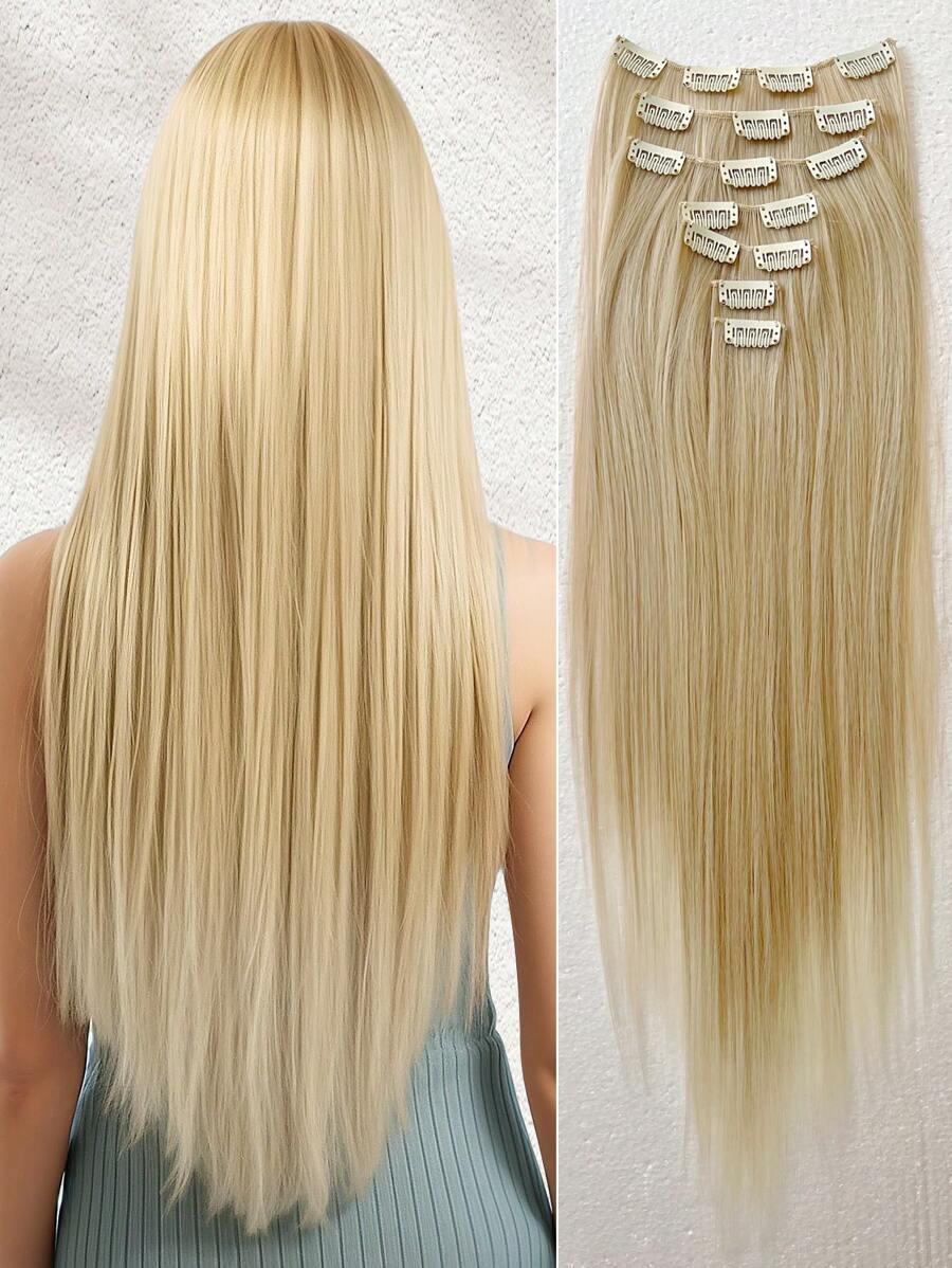 24英寸7片/套夹式合成假发接发,直发,金色,适合女性和女孩日常使用