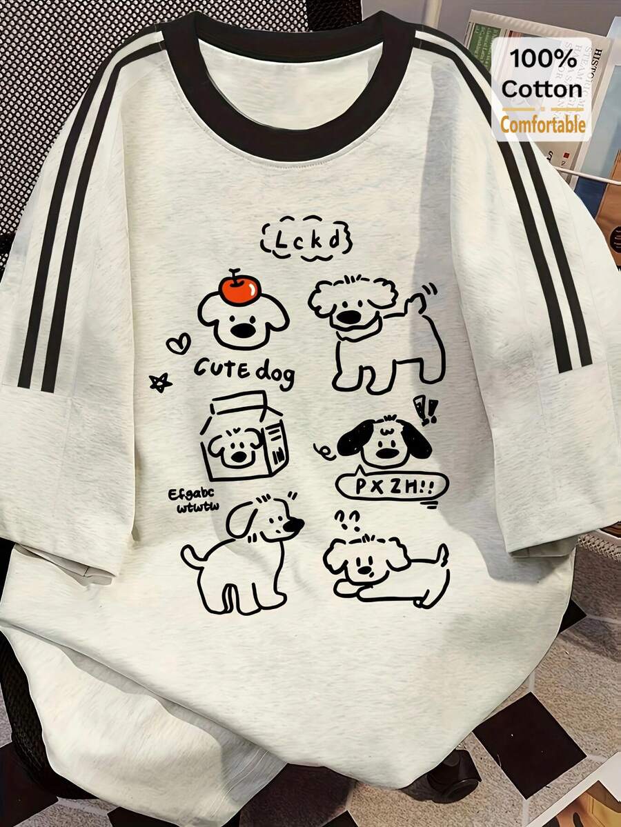 女式棉质超大字母条纹印花短袖T恤,宽松修身复古风格