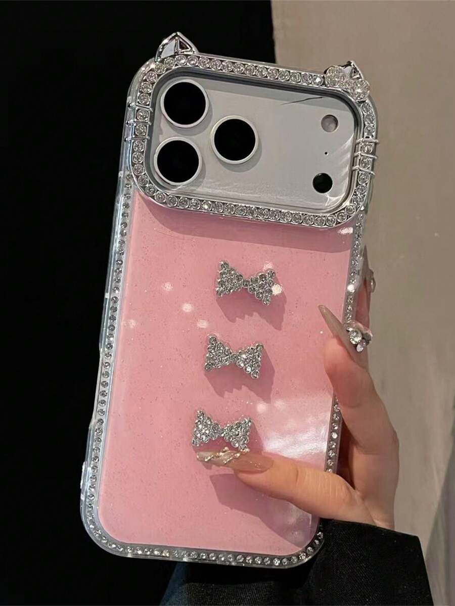 • 可爱3D水钻猫耳镜头保护闪亮蝴蝶结亮片手机壳,兼容 17 Pro Max、17 Pro、16 Pro Max、17、16、15 Pro Max、14 Plus、17 Air、13、12 Pro、11,奢华闪亮防摔后盖 - 粉色 - 查看 3