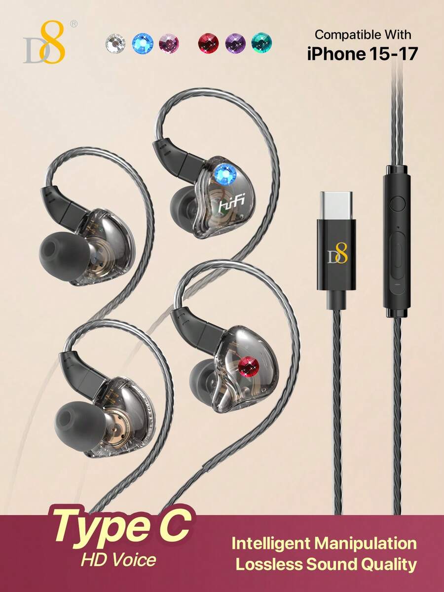 D8 女士奢华手工镶钻有线入耳式耳机,时尚透明外壳闪耀夺目,HiFi 立体环绕音质,内置高清麦克风,通话清晰,主动降噪功能有效阻隔环境噪音,通用 Type-C 接口,即插即用,时尚闪亮设计,完美适用于日常通勤、办公、学习、旅行、约会、聚会等场合,兼容 17/16