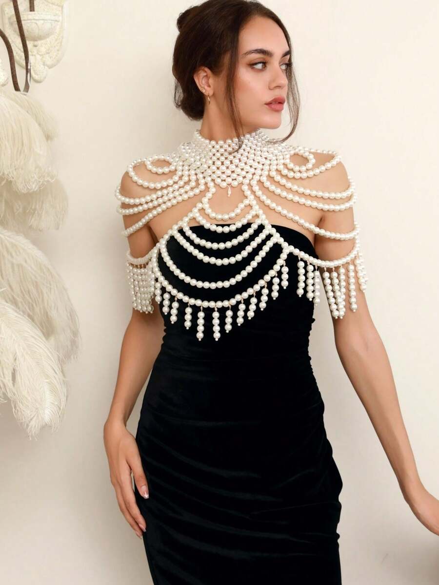 DEKUNER 1 件新款优雅奢华女士仿珍珠礼服上衣串珠婚宴身体链肩链欧洲中世纪风格珍珠新娘披肩