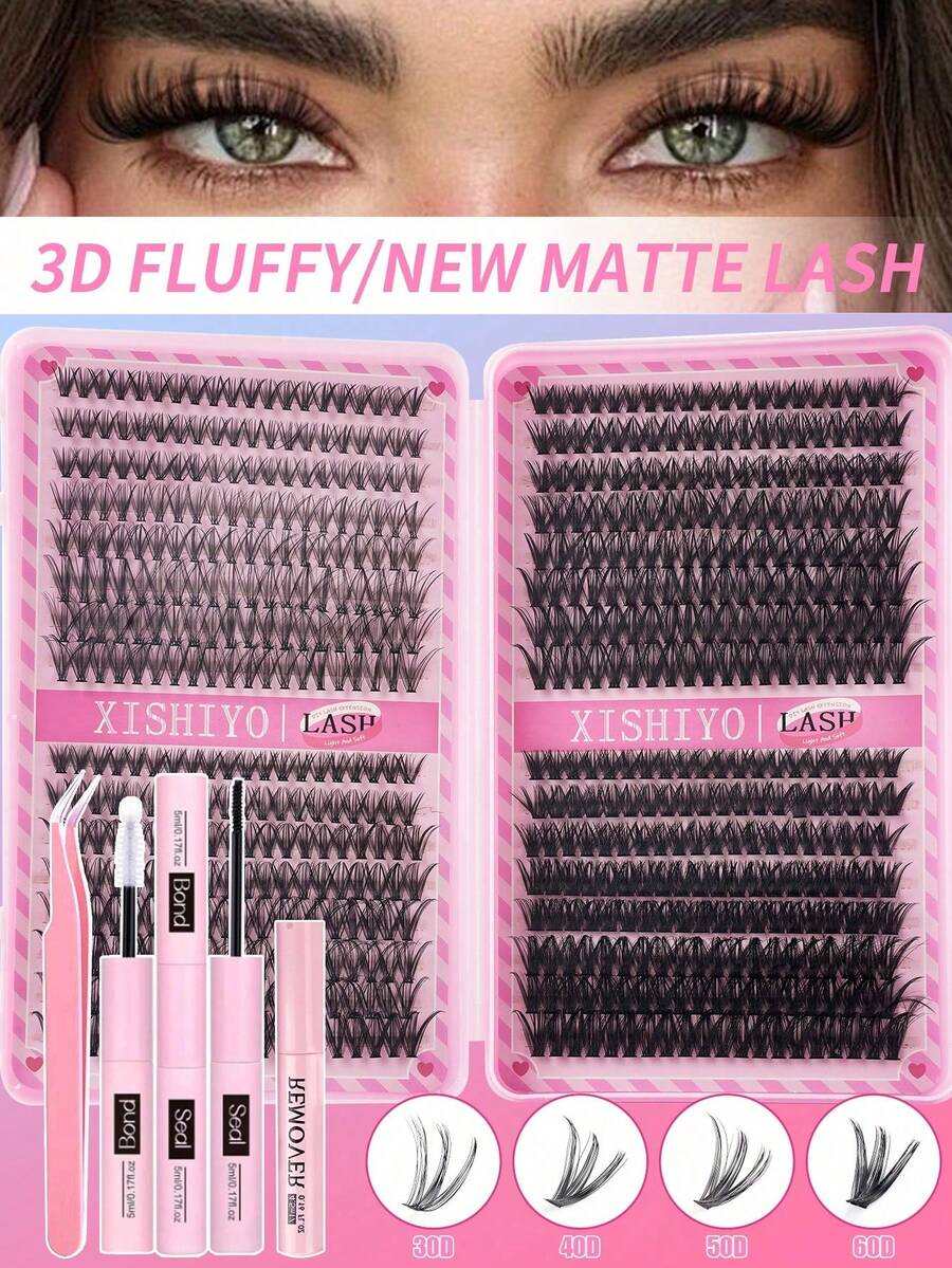 DIY睫毛嫁接套装,包含640根单根假睫毛、睫毛胶水、定型液、睫毛镊子、睫毛刷,可重复使用,适合圣诞节及其他场合。套装包含:睫毛嫁接胶水、睫毛、假睫毛等。