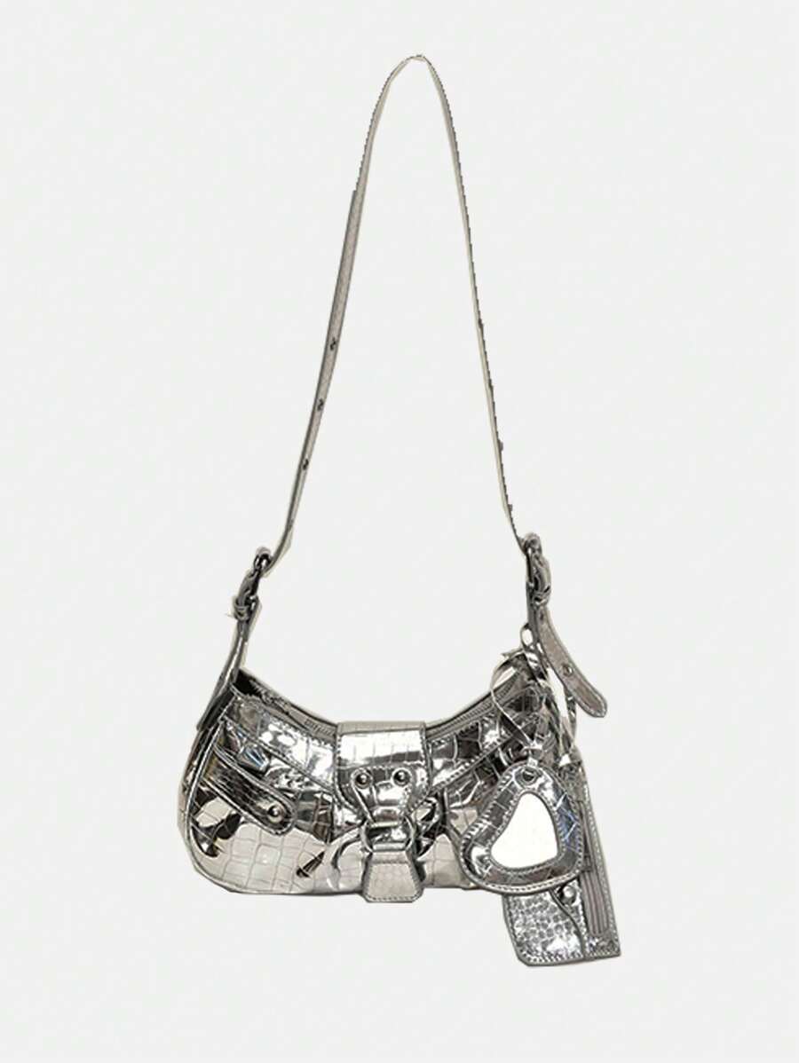 • Dedoo 2025夏季新款抽绳女包时尚水桶包铆钉摩托车包三件套宽肩带斜挎包 - 銀色 - 查看 7