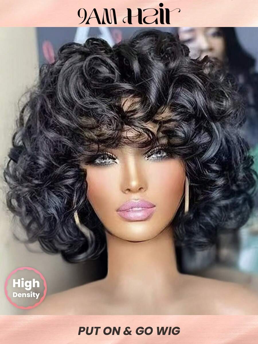 Density Pro “蓬松蓬松的卷发,100% 真人发质,带刘海,自然黑色,6 英寸长,200% 超高密度,轻松佩戴,初学者友好设计,蓬松蓬松的卷发,适合早上 9 点的发型,运动、度假、旅行、节日、舞会、户外角色扮演、校园、学校、海滩、婚礼、露营、节日装扮、夏季装扮、Vacay Vibes 魅力、优雅休闲、Y2k 时尚风格,SS25 关键词和自然发际线,可调节肩带和舒适的帽式结构”