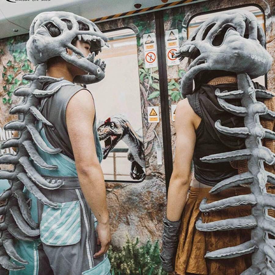 恐龙骨架面具 - 毛茸茸的霸王龙头骨连帽面具,带柔软毛绒下颚,适合儿童和成人,趣味恐怖万圣节角色扮演,恐龙派对礼物,带有咆哮音效(均码)