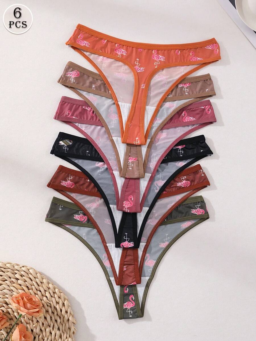 6 条装女士火烈鸟印花冰丝丁字裤无缝低腰丁字裤 - 柔软透气,舒适,适合日常穿着、运动、瑜伽三角裤