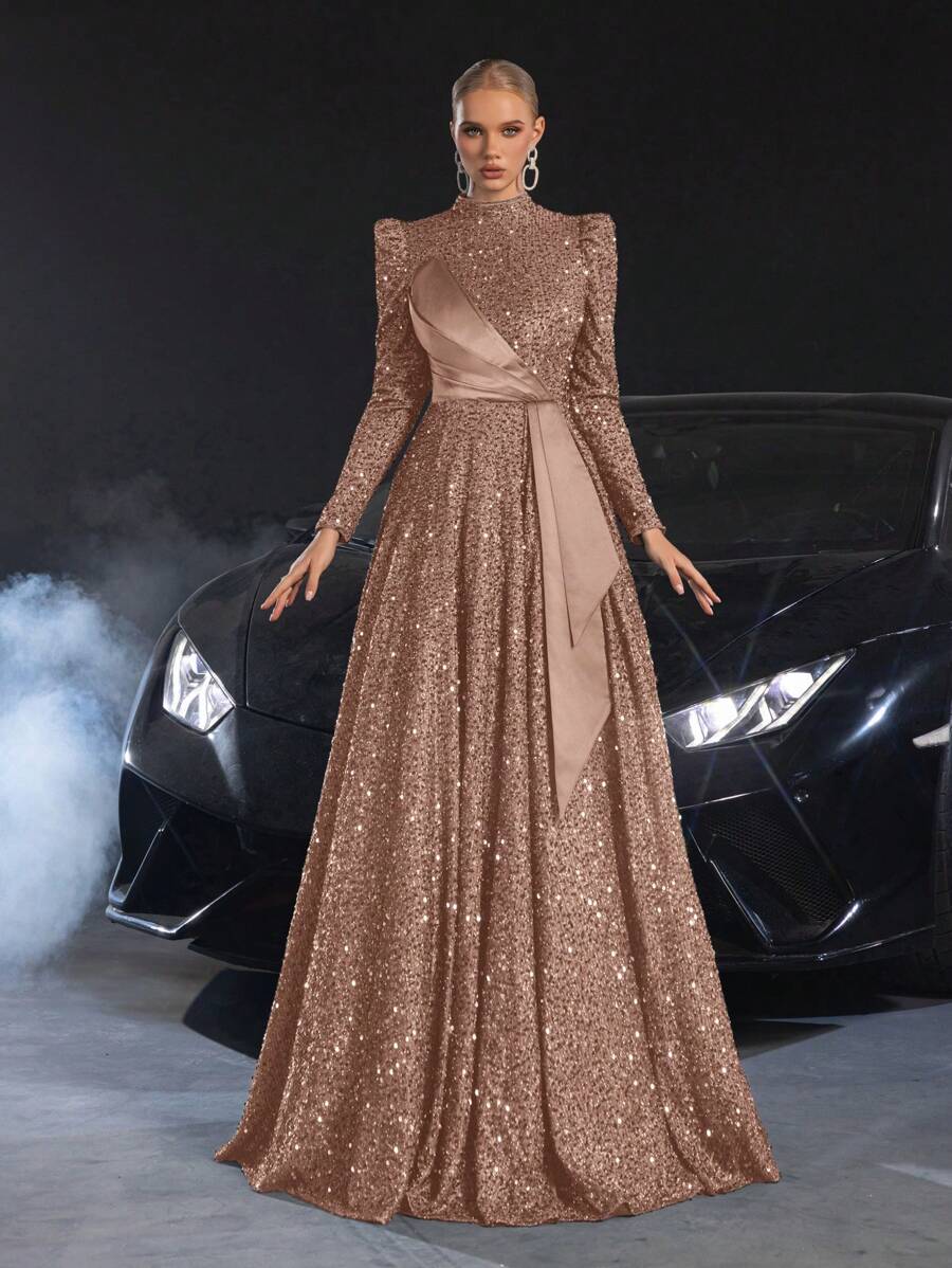 Elisanya 优雅立领撞色缎面亮片礼服、派对礼服、婚礼宾客礼服、晚礼服