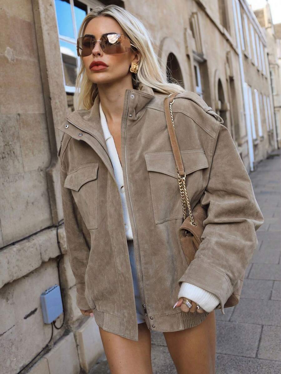 • 优雅女士麂皮夹克,长袖,翻领,带口袋,拉链,女士外套,时尚复古,高街品牌 - 卡其色 - 查看 2