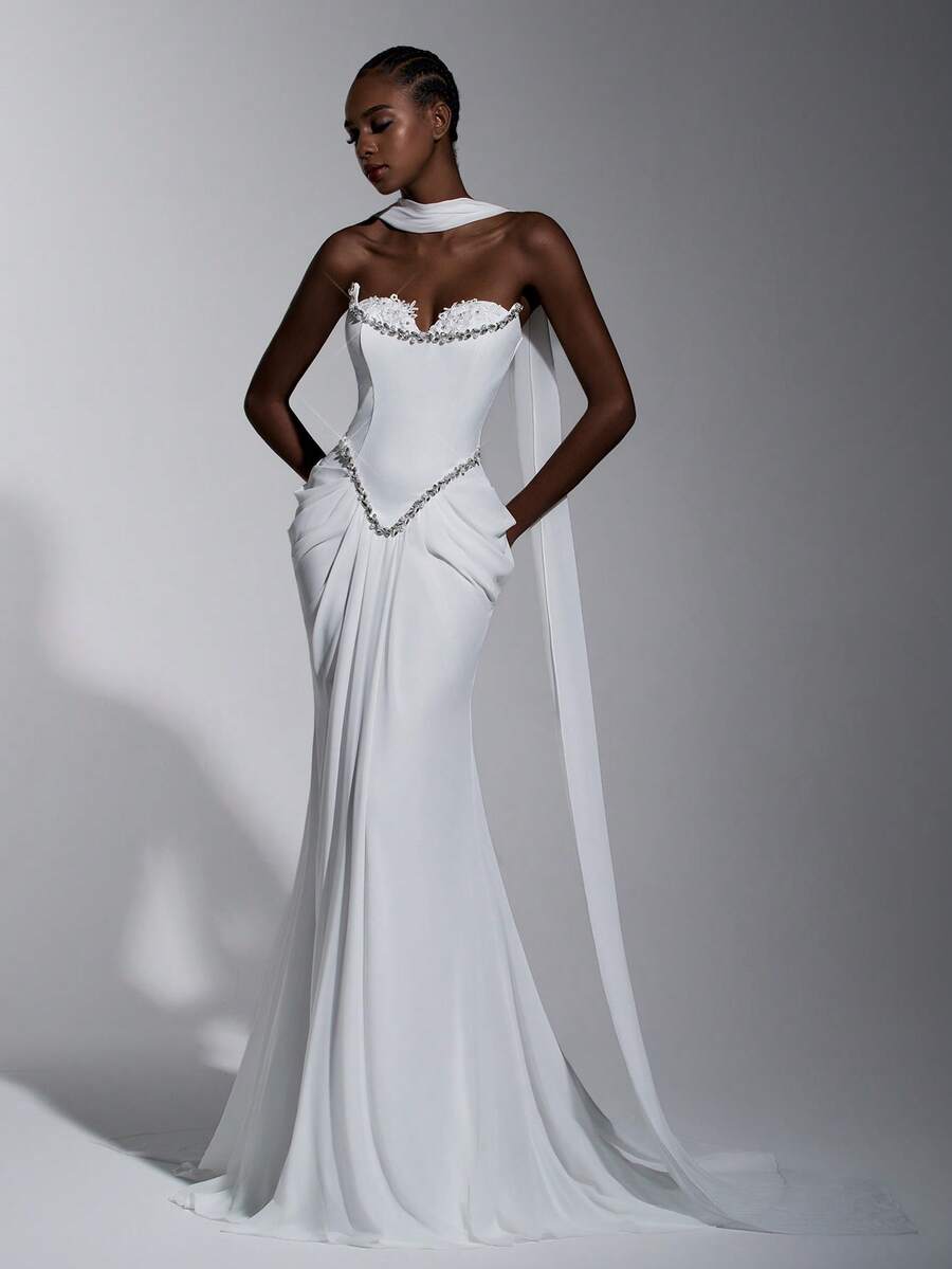 Elitara 优雅蕾丝拼接雪纺二合一心形领口美人鱼婚纱,带荷叶边拖尾