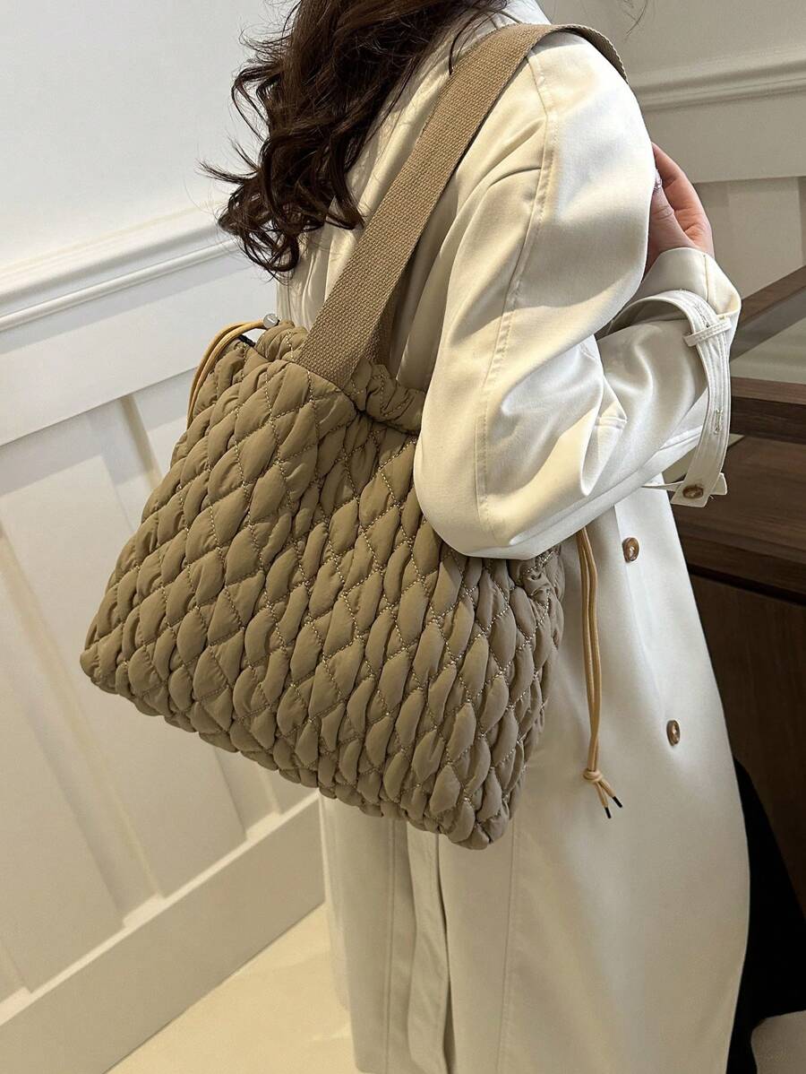 刺绣格子时尚单肩包,抽绳流浪包适合女孩和女士,非常适合购物、通勤、周末度假和日常使用