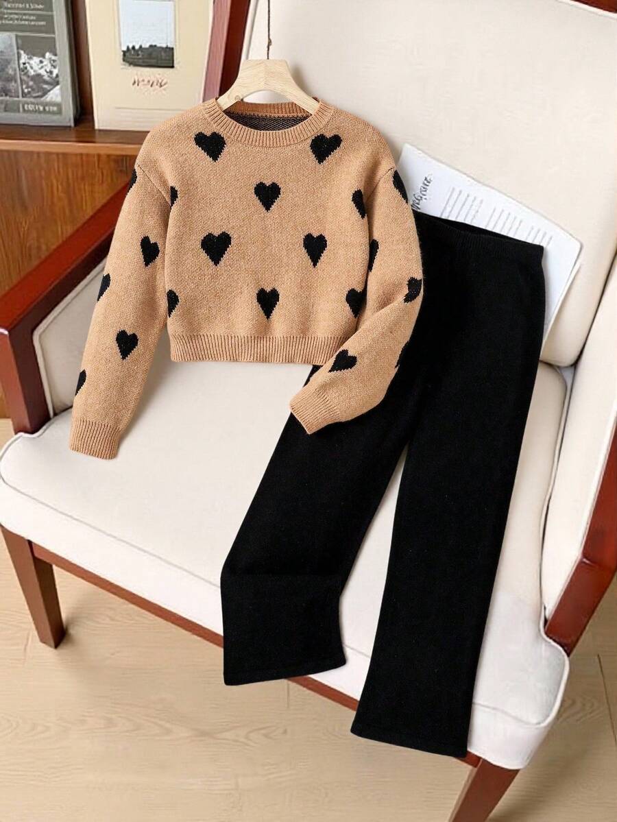 时尚女童爱心图案针织毛衣搭配黑色休闲裤,适合居家、外出、聚会、返校等场合。