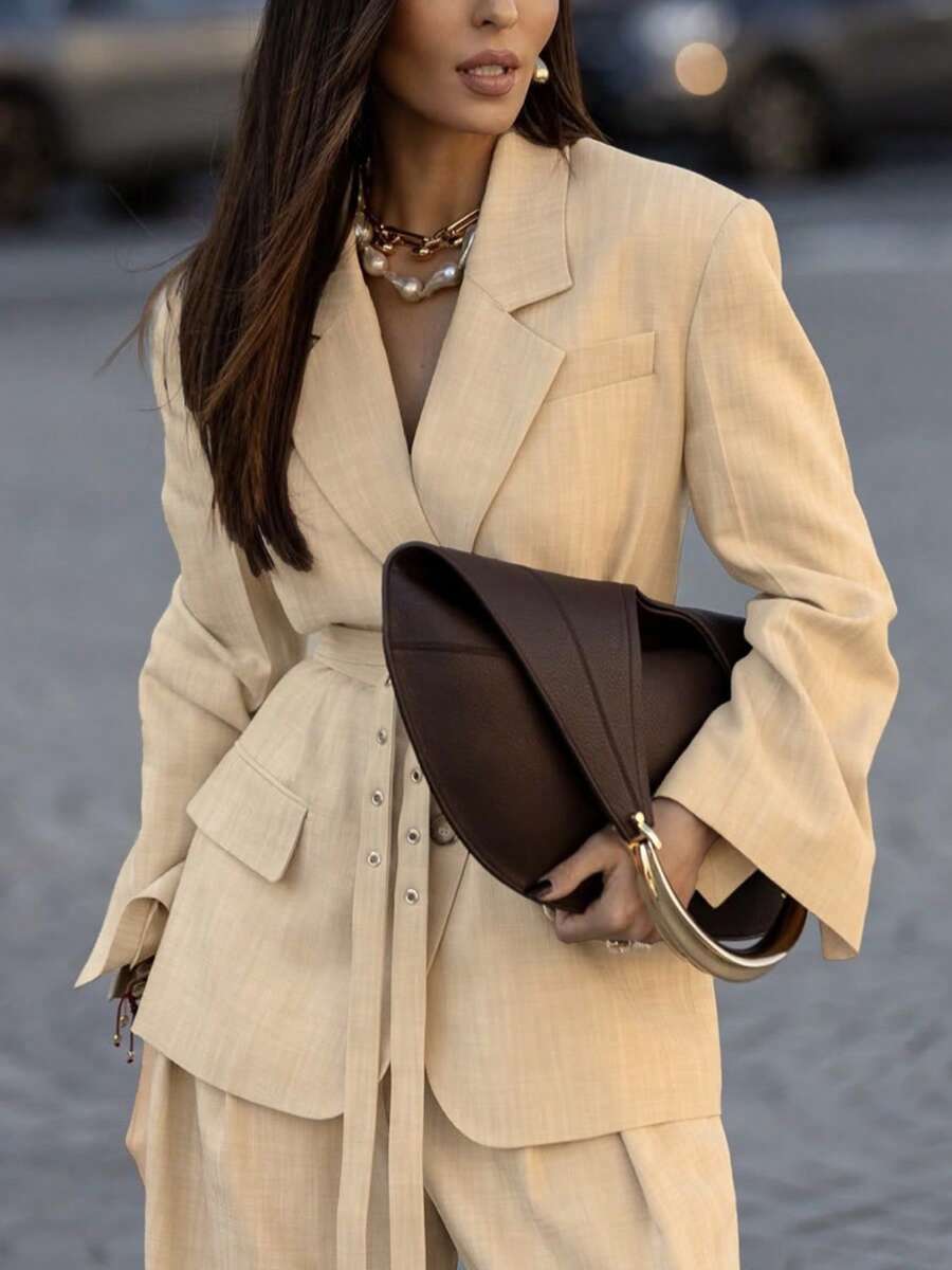 时尚新款欧美女士纯色套装,翻领、腰带装饰,开襟外套搭配宽松阔腿裤,两件套,通勤时尚优雅。