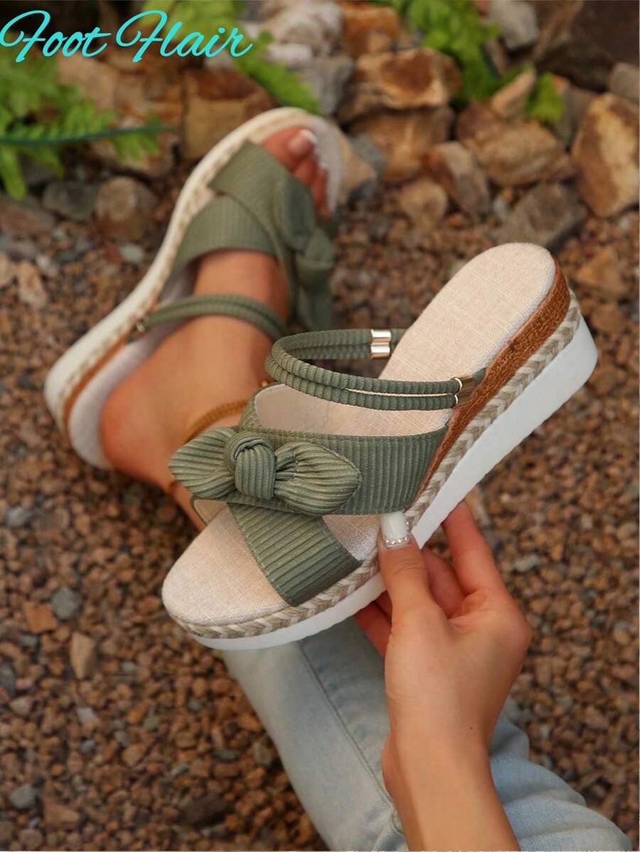 Foot Flair 加大码女式蝴蝶装饰露趾两穿帆布厚底坡跟凉鞋,波西米亚海滩度假风格,百搭春夏季款,绿色