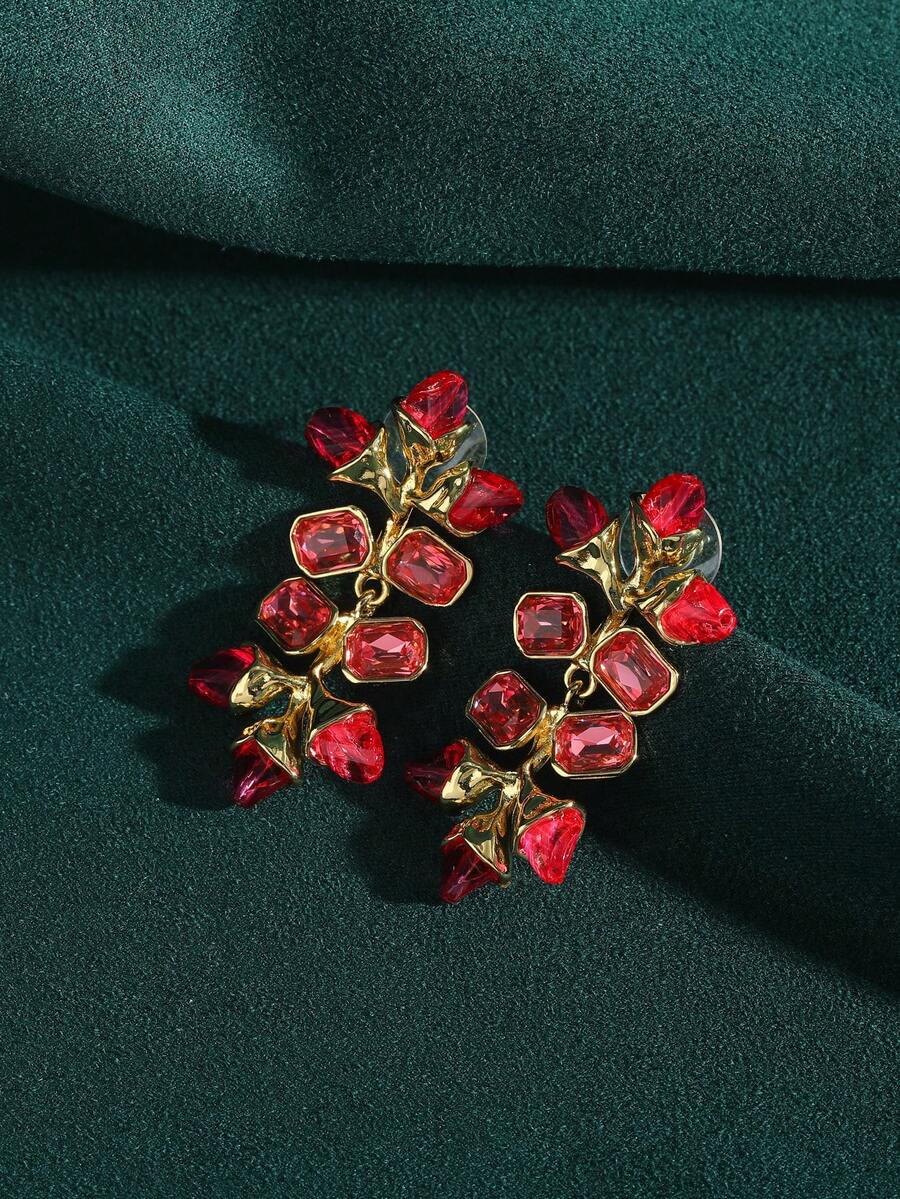 法式奢华金叶水晶吊坠耳环,方晶锆石,渐变色设计,18K镀金