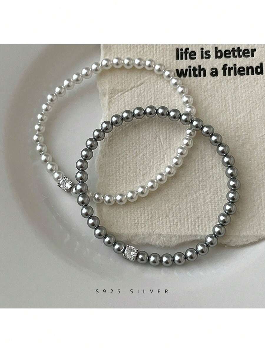 1 串 4 毫米圆形珍珠和 S925 锆石 16 厘米优雅手链,适合女性日常生活或派对
