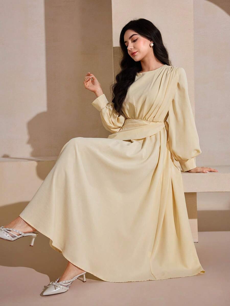 Graceveil 淡黄色优雅褶皱腰带领长袖飘逸连衣裙