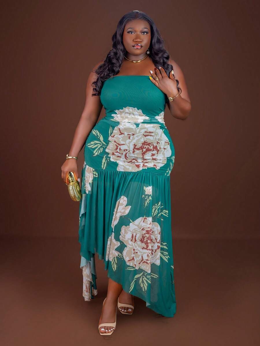 CurvyTilda 大码针织网眼褶饰抹胸连衣裙