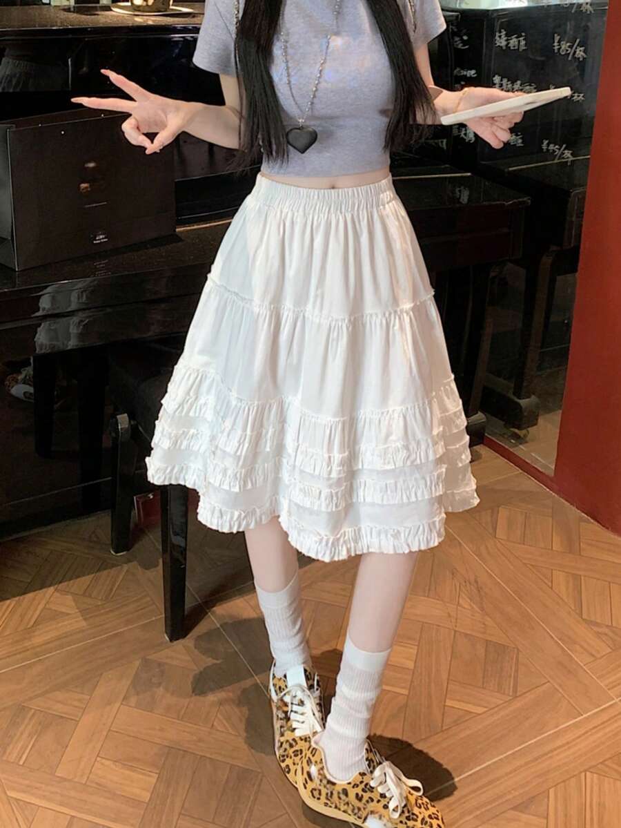 高腰飘逸荷叶边A字裙,白色,休闲百搭,2026春夏韩版风格
