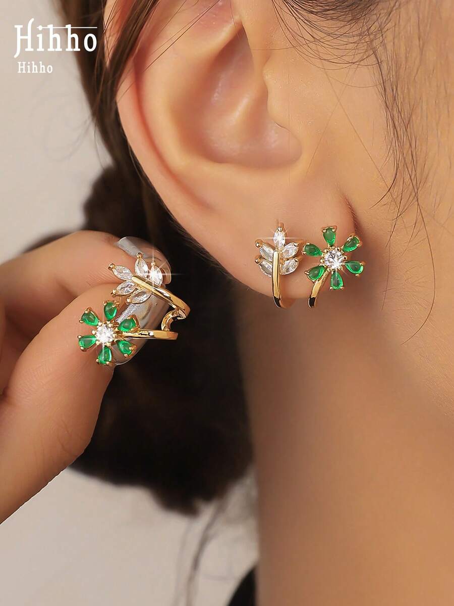Hihho 2件套时尚闪亮锆石花叶耳钉,优雅礼物,适合女孩约会之夜
