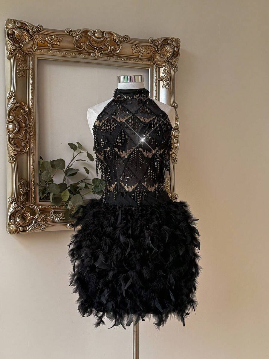Lovelzi 优雅奢华黑色串珠刺绣手工钻石羽毛装饰短款露背鸡尾酒会礼服