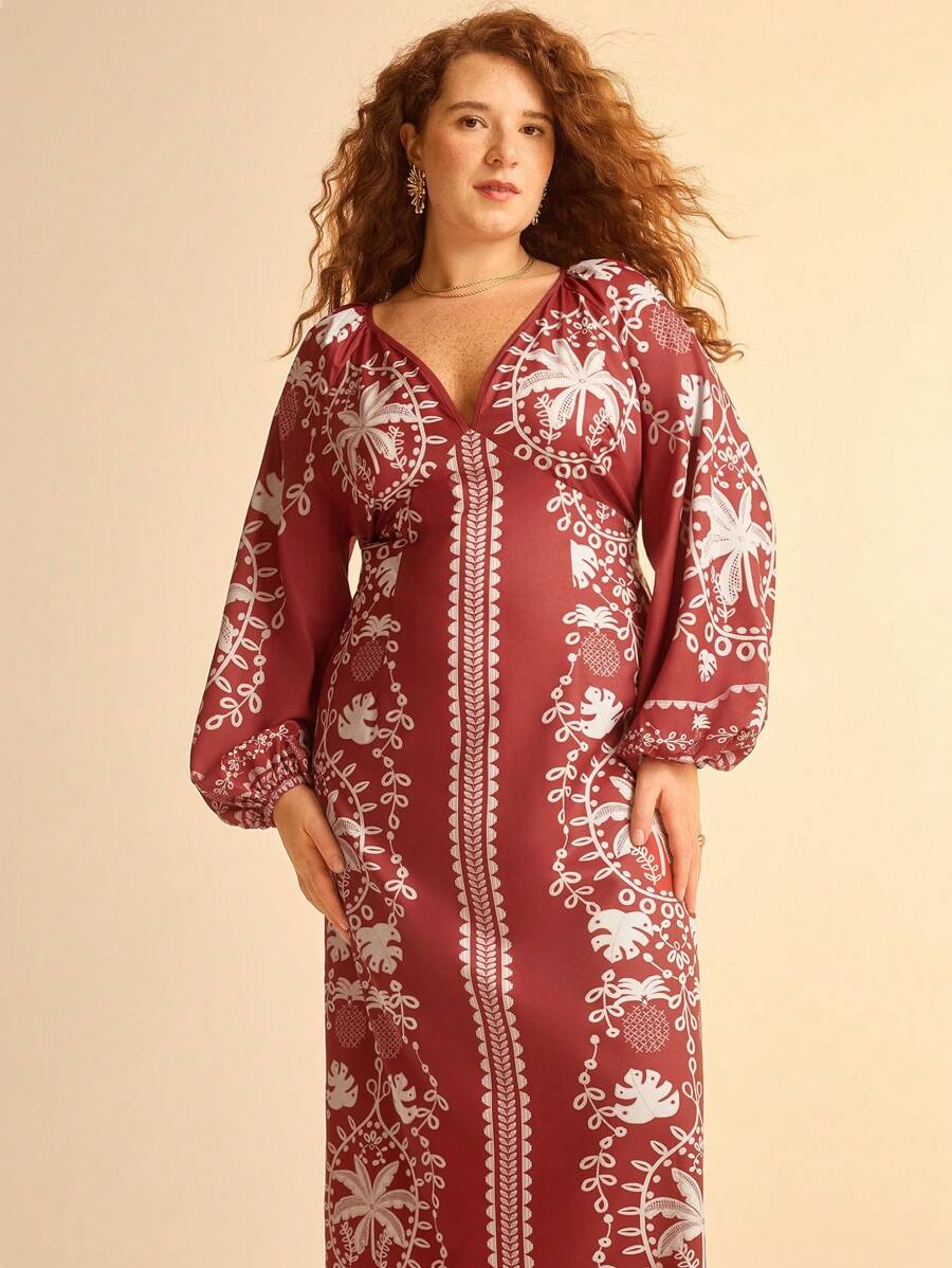 CAJUNI 加大码女式波西米亚风热带红色龟叶、菠萝、椰子树印花度假休闲海滩深 V 领灯笼袖露背长裙