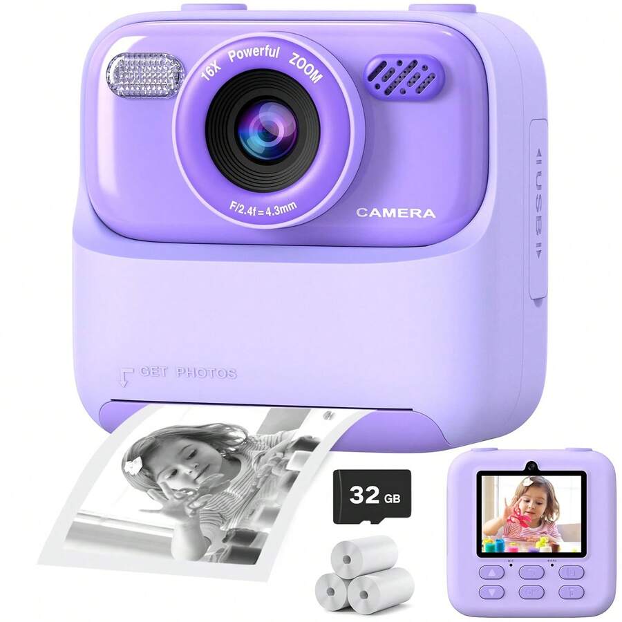 即时数码相机,1080P双镜头自拍数码相机,附赠打印纸和32G存储卡,礼品玩具,紫色/蓝色/粉色