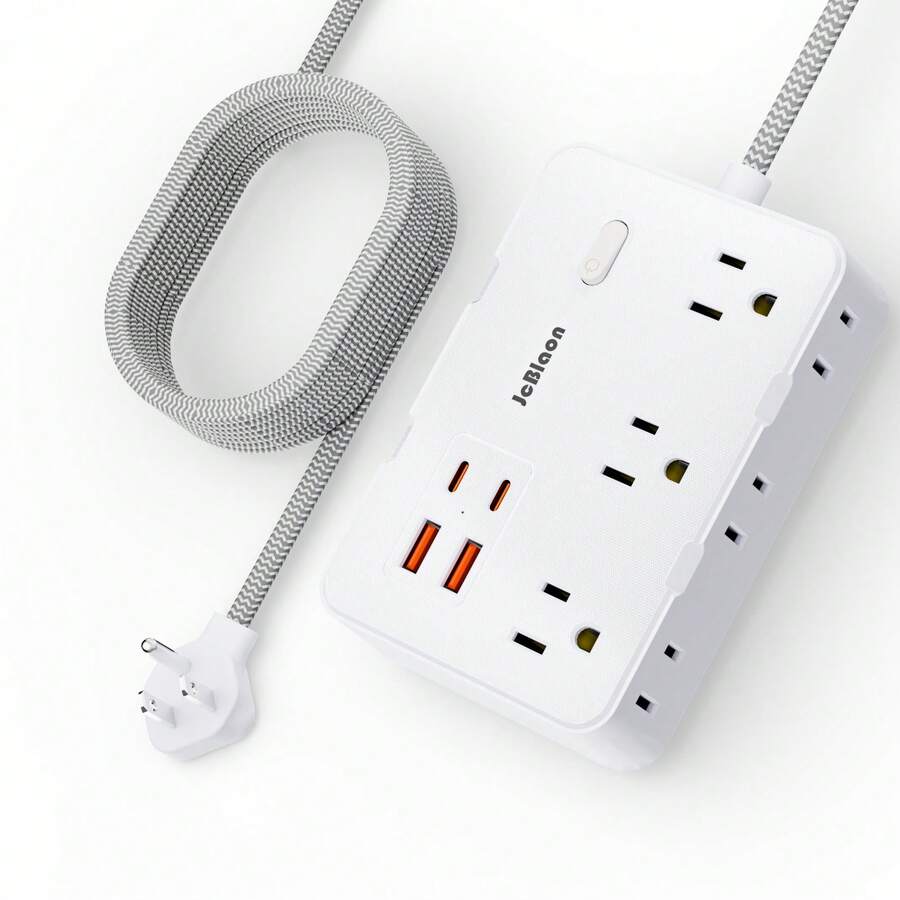 JcBlaon 6位扁平插头电源排插,带4个USB接口(2个USB-C),5英尺编织线,可壁挂安装,适用于家庭、宿舍等场所。