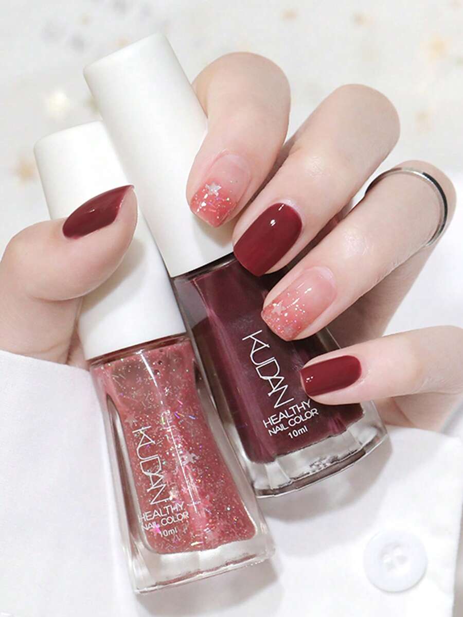 KUDAN 2瓶10毫升水性指甲油套装,快干、持久、免烤、可撕拉、淡香型、红粉色闪粉指甲油,适合居家美甲DIY和美甲沙龙美甲用品。