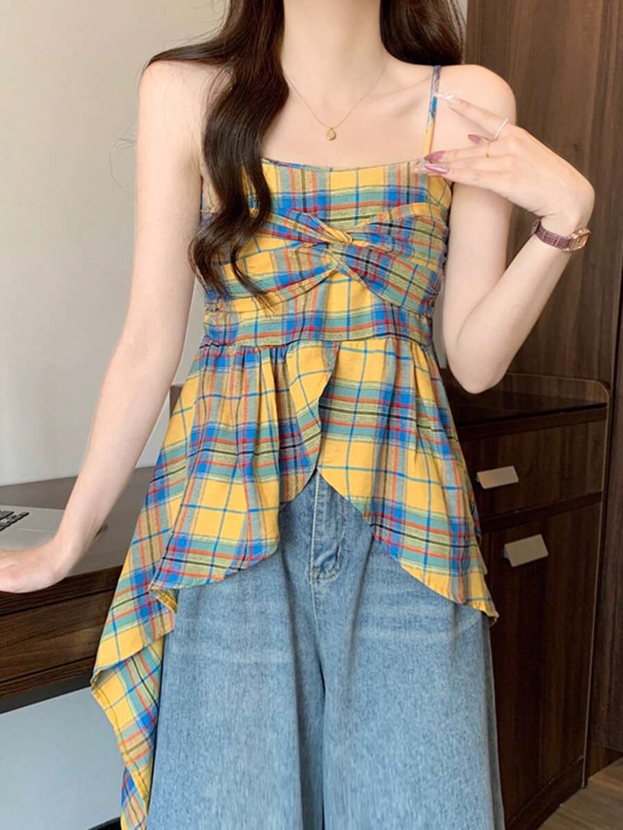 复古格纹吊带背心,多巴胺氛围,甜辣不对称短款上衣,夏季