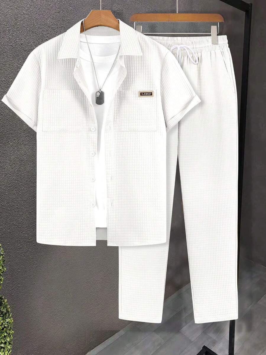 男士休闲两件套,夏季短袖树脂纽扣领衬衫搭配抽绳长裤,质感涤纶面料,双口袋+独特Logo,经典纯色