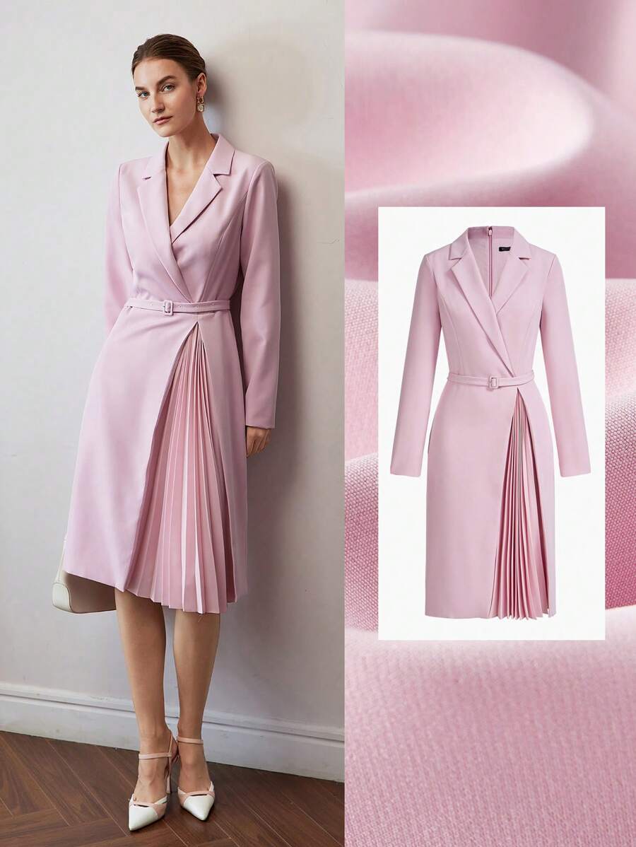 MOTF PREMIUM 翻领褶饰面板扣带腰带中长连衣裙
