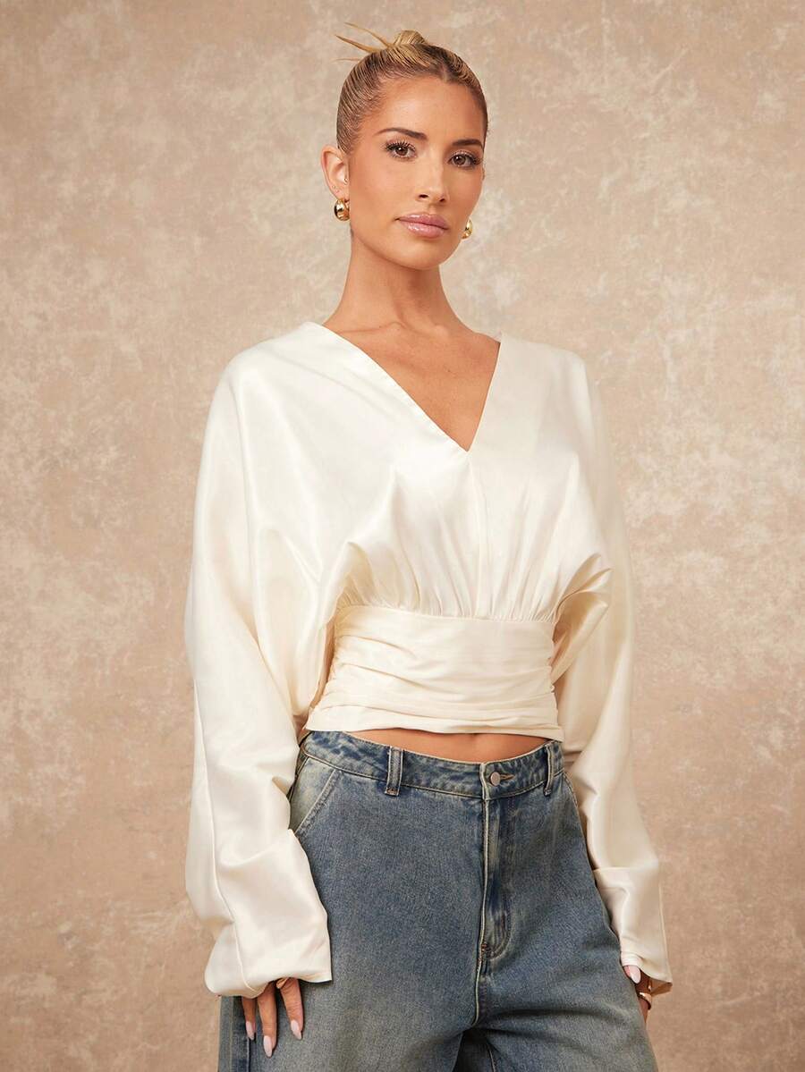 Lumalex 缎面褶皱系带V领蝙蝠袖长袖女式上衣