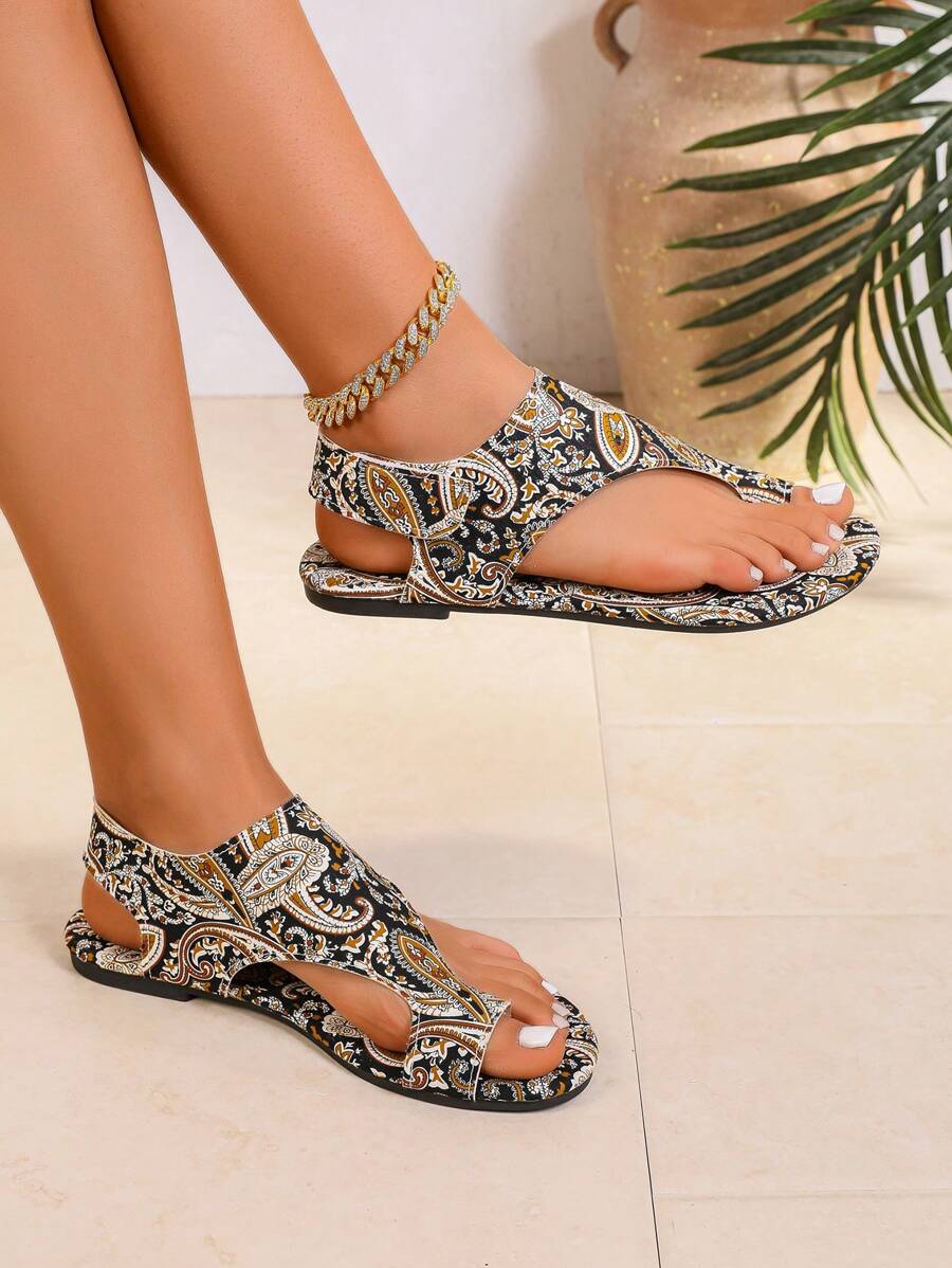 女士波西米亚风格向日葵印花钩环平底凉鞋,欧洲时尚休闲复古设计露趾平底凉鞋